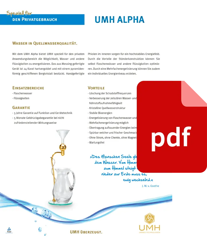 UMH Alpha pruža mogućnost energetskog obogaćivanja vode i drugih tečnosti, posebno prilagođenu za privatnu upotrebu. Izrađen od specijalnog mesinga, uređaj je pozlaćen 24-karatnim tvrdim zlatom i ukrašen gorskim kristalom brušenim u obliku piramide.