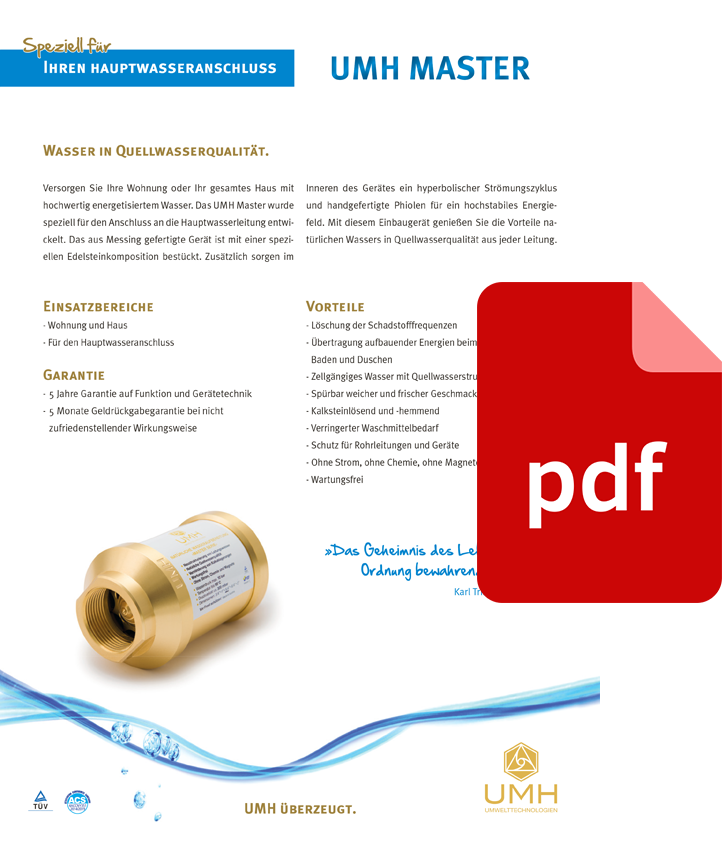 Obezbijedite svom stanu ili cijeloj kući visokokvalitetnu, energetizovanu vodu. UMH Master je posebno dizajniran za priključak na glavnu vodovodnu cijev. Izrađen od specijalnog mesinga, uređaj je opremljen unutrašnjim jezgrom koje sadrži jedinstven sastav dragog kamenja. Dodatno, unutar uređaja se odvija hiperbolični ciklus protoka uz pomoć ručno izrađenih staklenih ampula, što stvara visoko stabilno energetsko polje. Uz ovu ugradnu jedinicu, uživaćete u blagodatima prirodne vode kvaliteta izvorske vode na svakoj slavini u vašem domu.