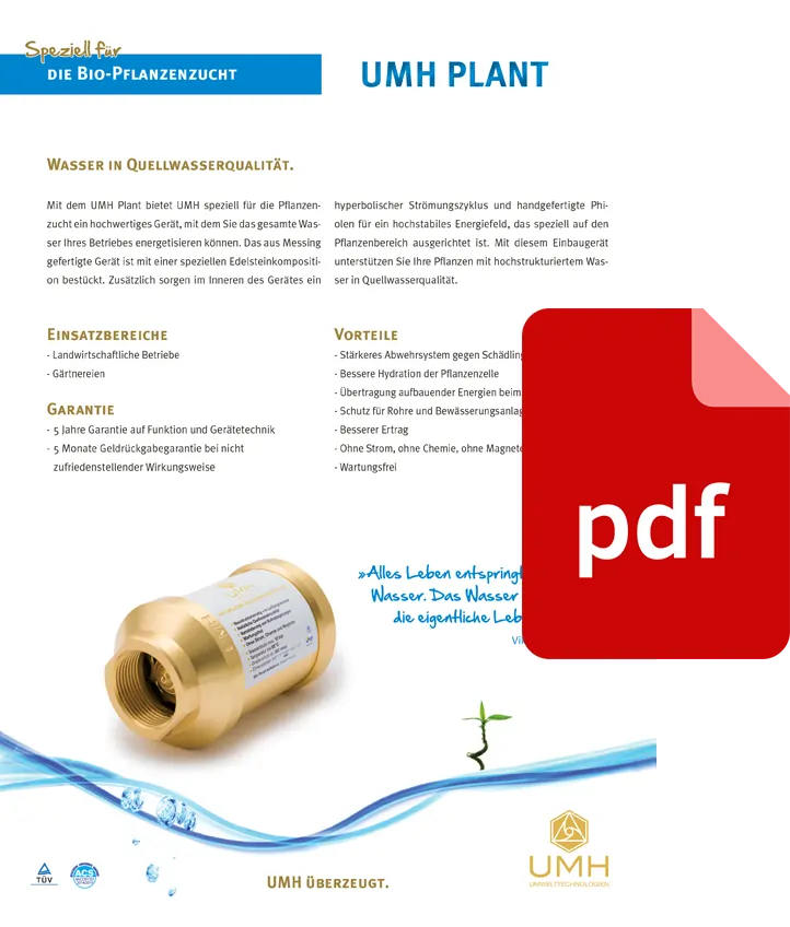 Uz UMH Plant, kompanija UMH nudi visokokvalitetan uređaj specijalizovan za uzgoj biljaka, kojim možete energizovati cjelokupnu vodu na vašem imanju. Izrađen od specijalnog mesinga, uređaj je opremljen posebnom kompozicijom dragog kamenja. Pored toga, unutar jedinice, hiperbolični ciklus protoka i ručno izrađene ampule — posebno dizajnirane za potrebe biljnog svijeta — osiguravaju visoko stabilno energetsko polje.