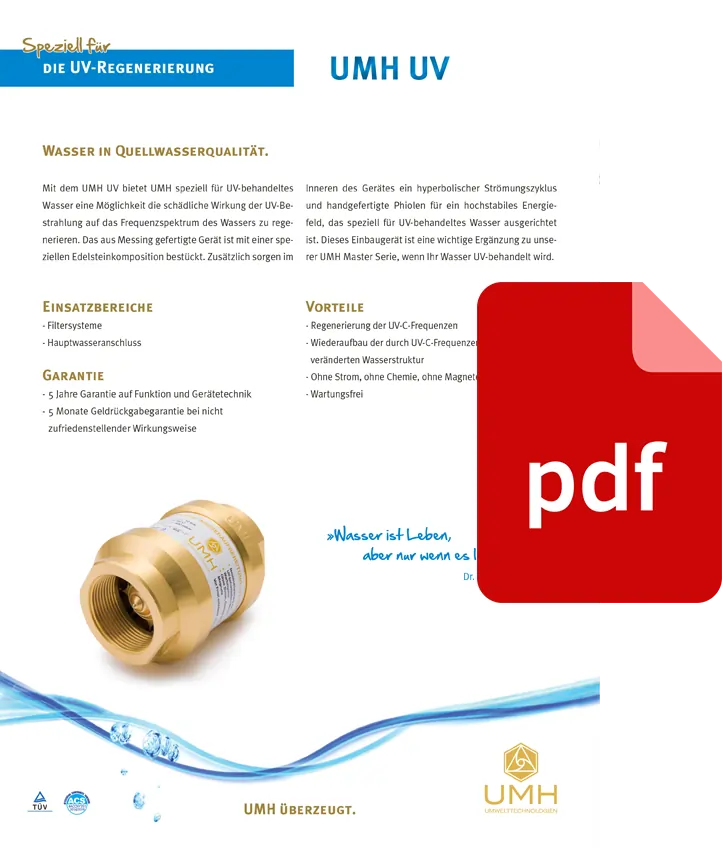 Uz UMH UV, kompanija UMH nudi specifično rješenje za vodu tretiranu UV zracima, omogućavajući regeneraciju frekvencijskog spektra vode koji je narušen štetnim efektima UV zračenja. Izrađen od specijalnog mesinga, uređaj je opremljen posebnom kompozicijom dragog kamenja.